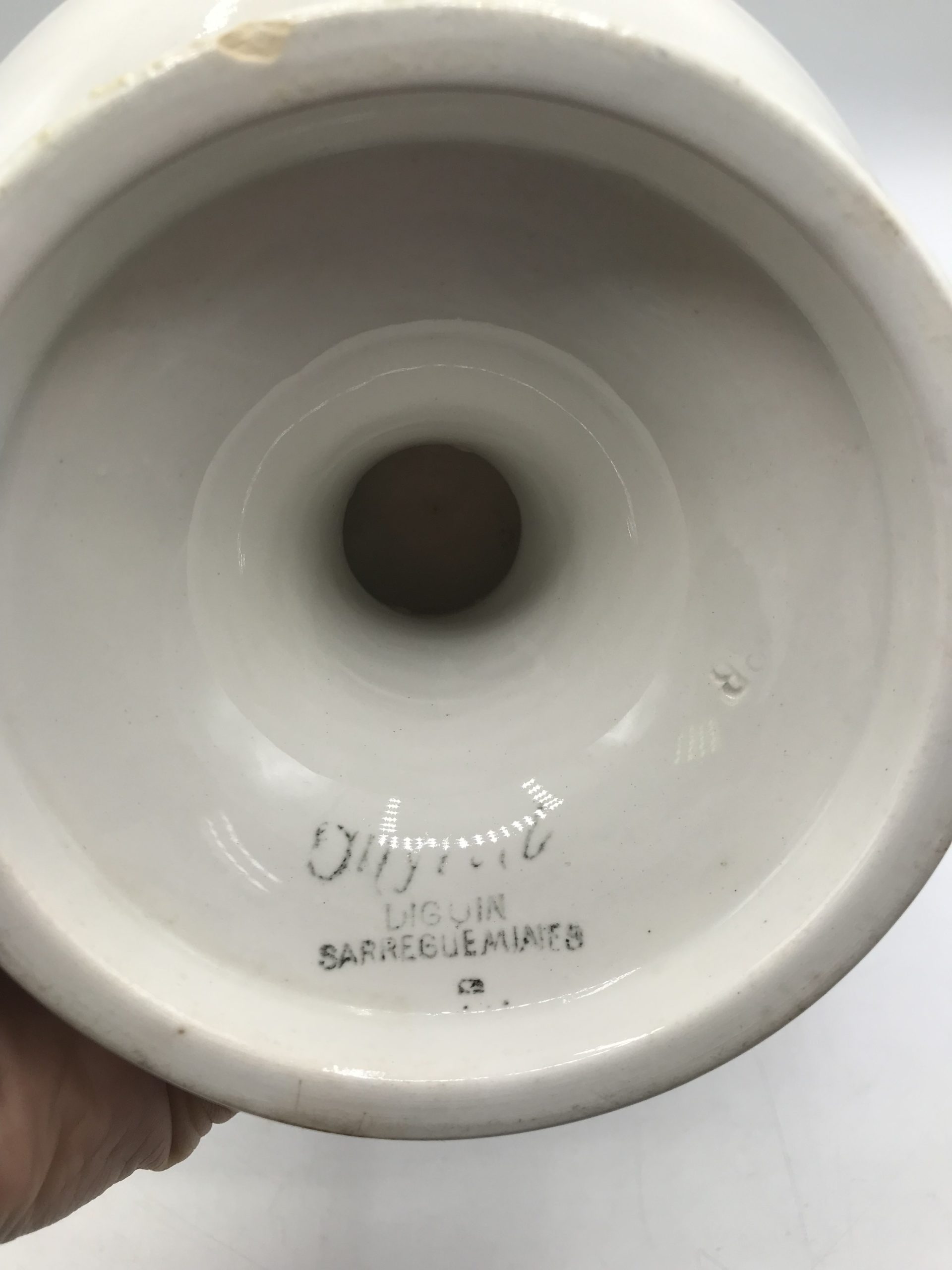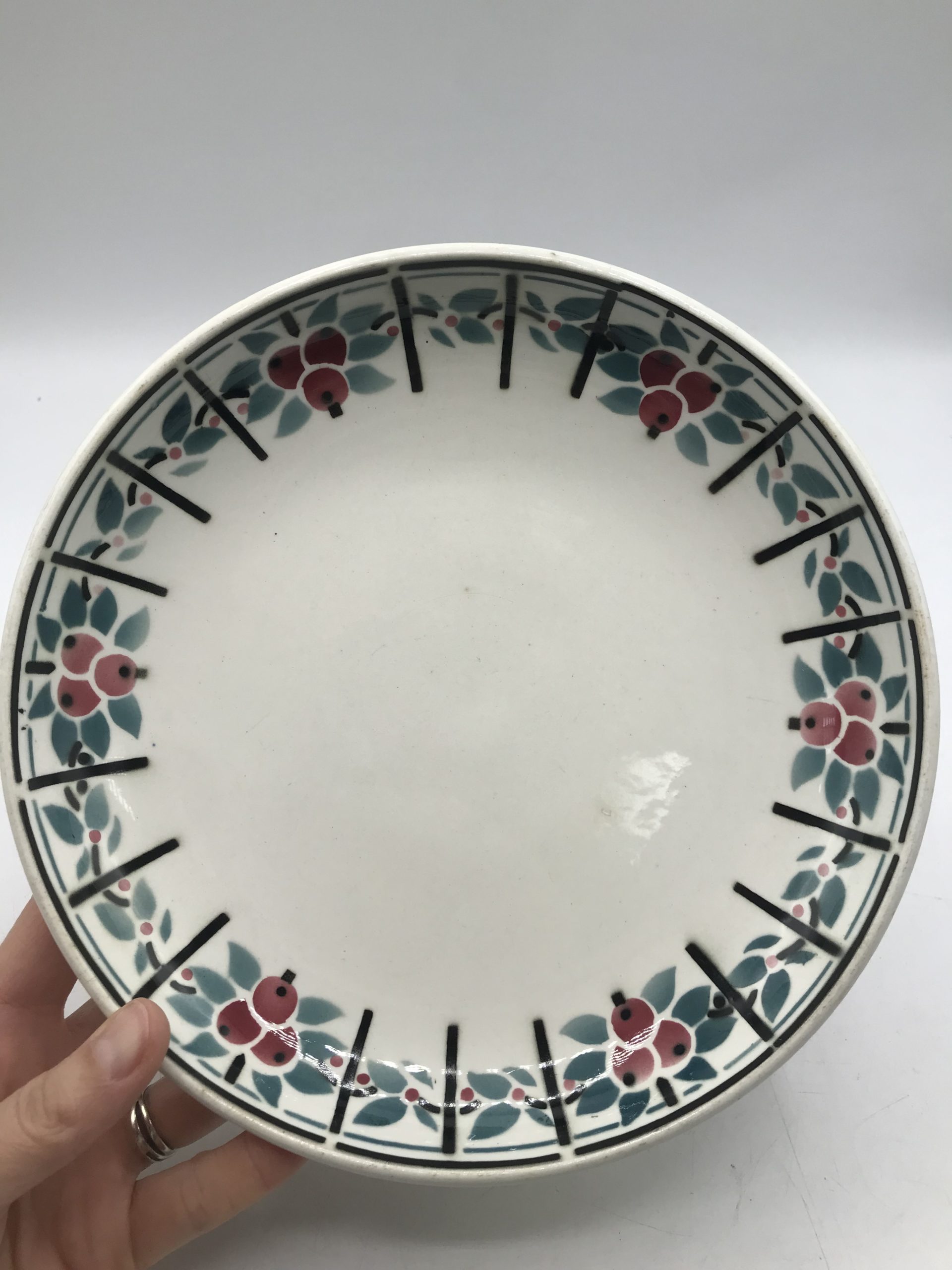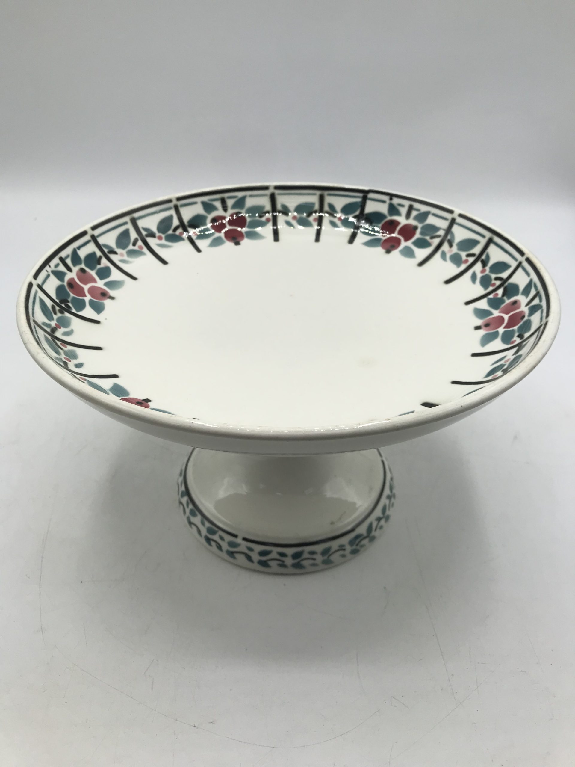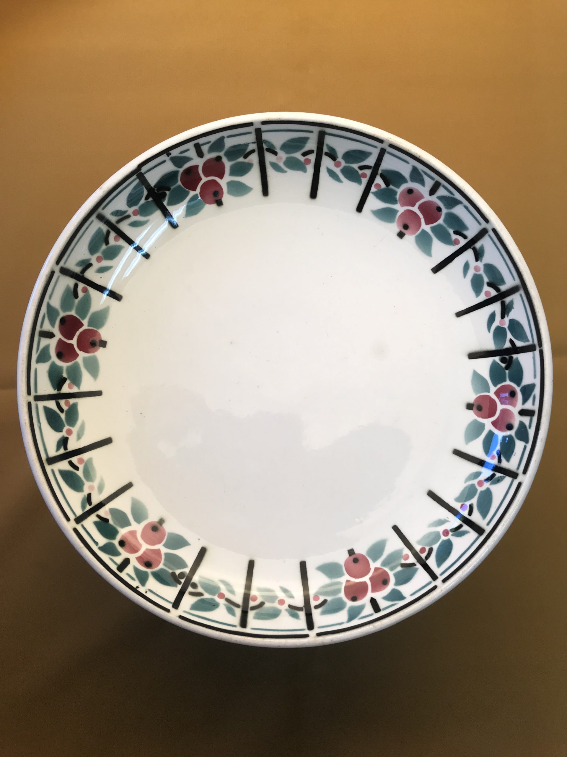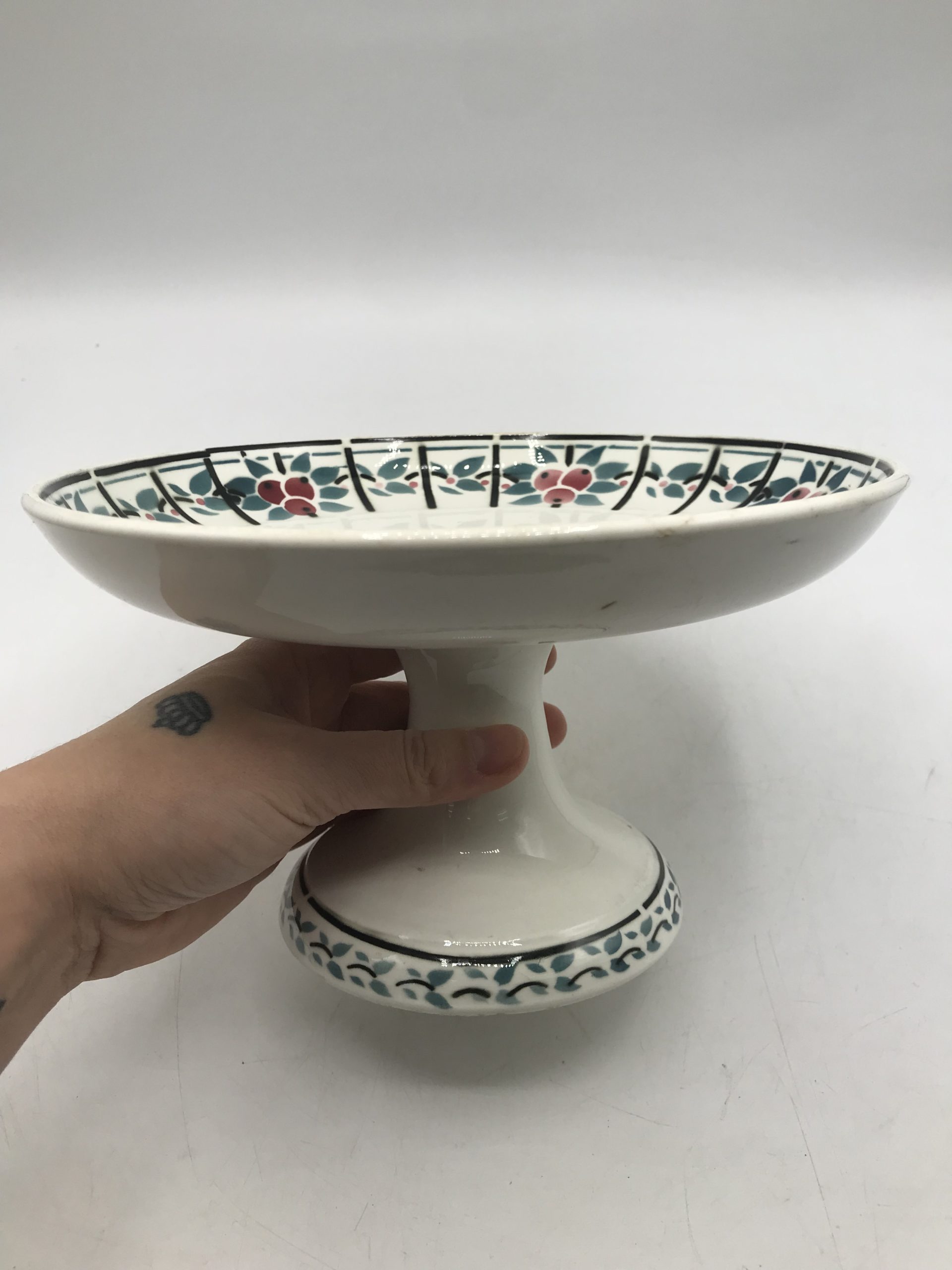 Magnifique compotier signĂ© Sarreguemines Digoin. Une très belle pièce de vaisselle, on y voit des motifs vert d’eau et rose qui reprĂ©sentent des baies. Il mesure 13 cm de hauteur pour un plateau de diamètre 22 cm. Une belle pièce d’ancienne vaisselle qui peut mettre en valeur vos dessert ou fruits. Laisser vous sĂ©duire par son charme d’antan et ses motifs graphiques. Quelques lĂ©gères marques du temps mais rien de notable.