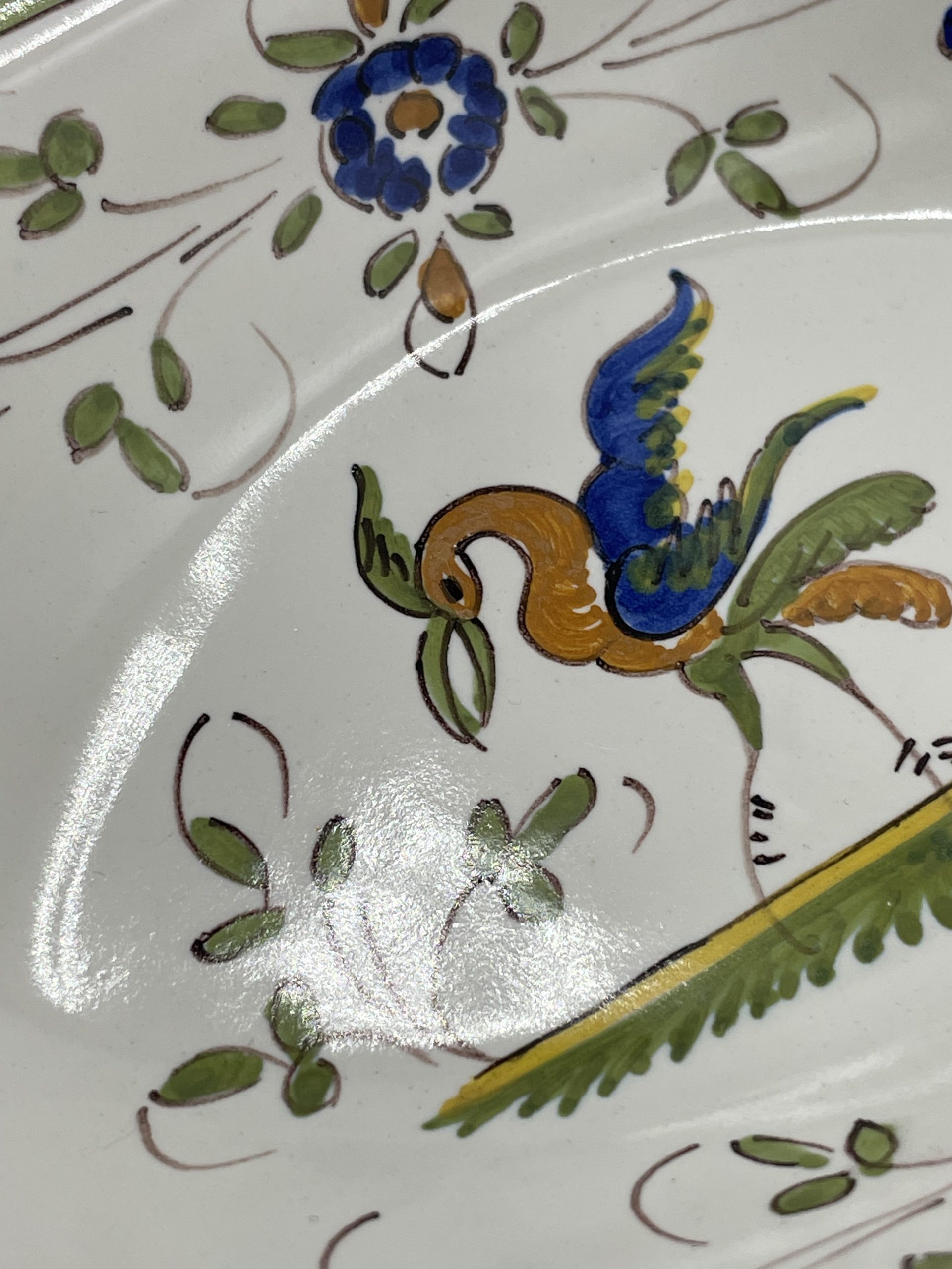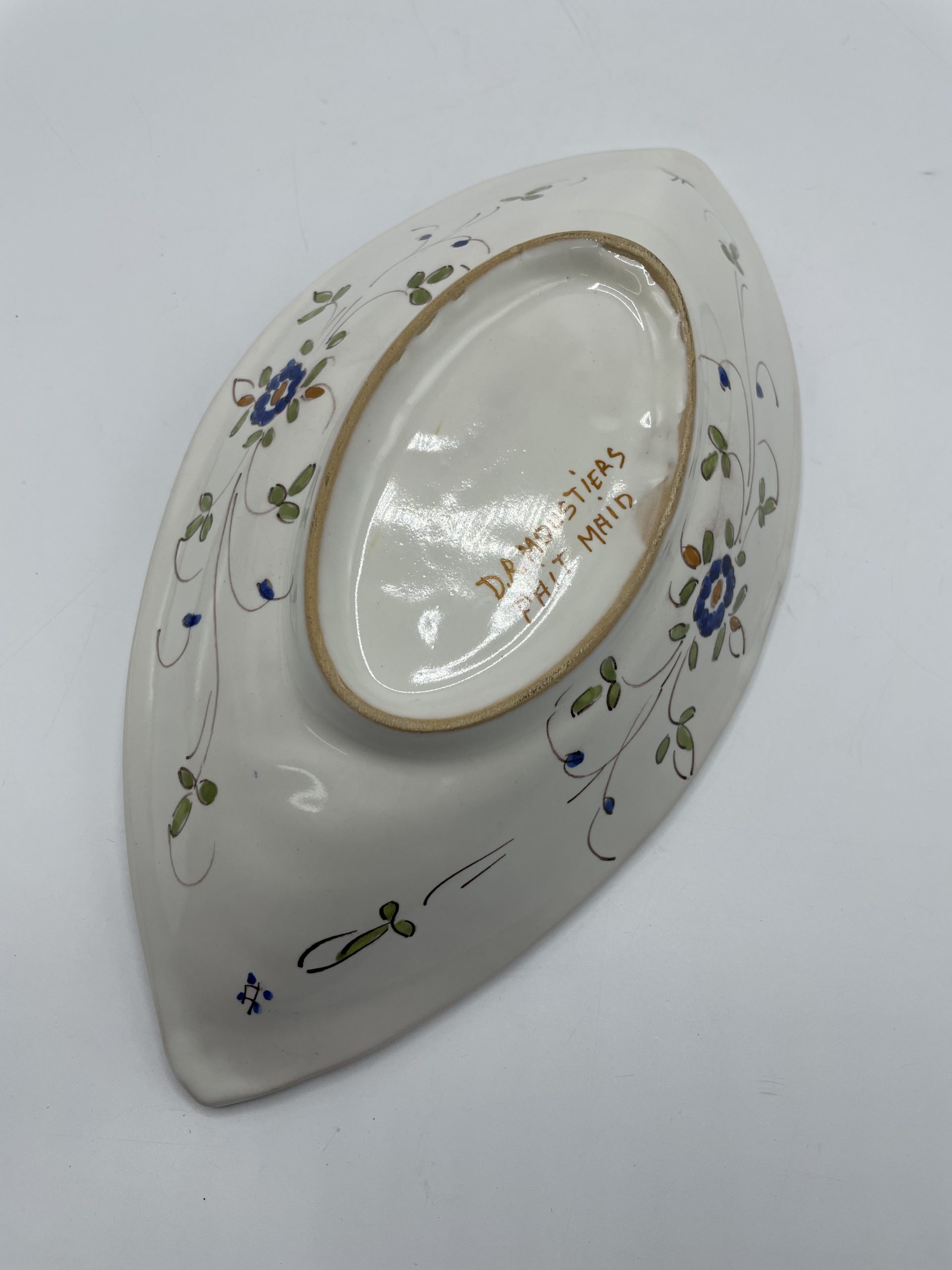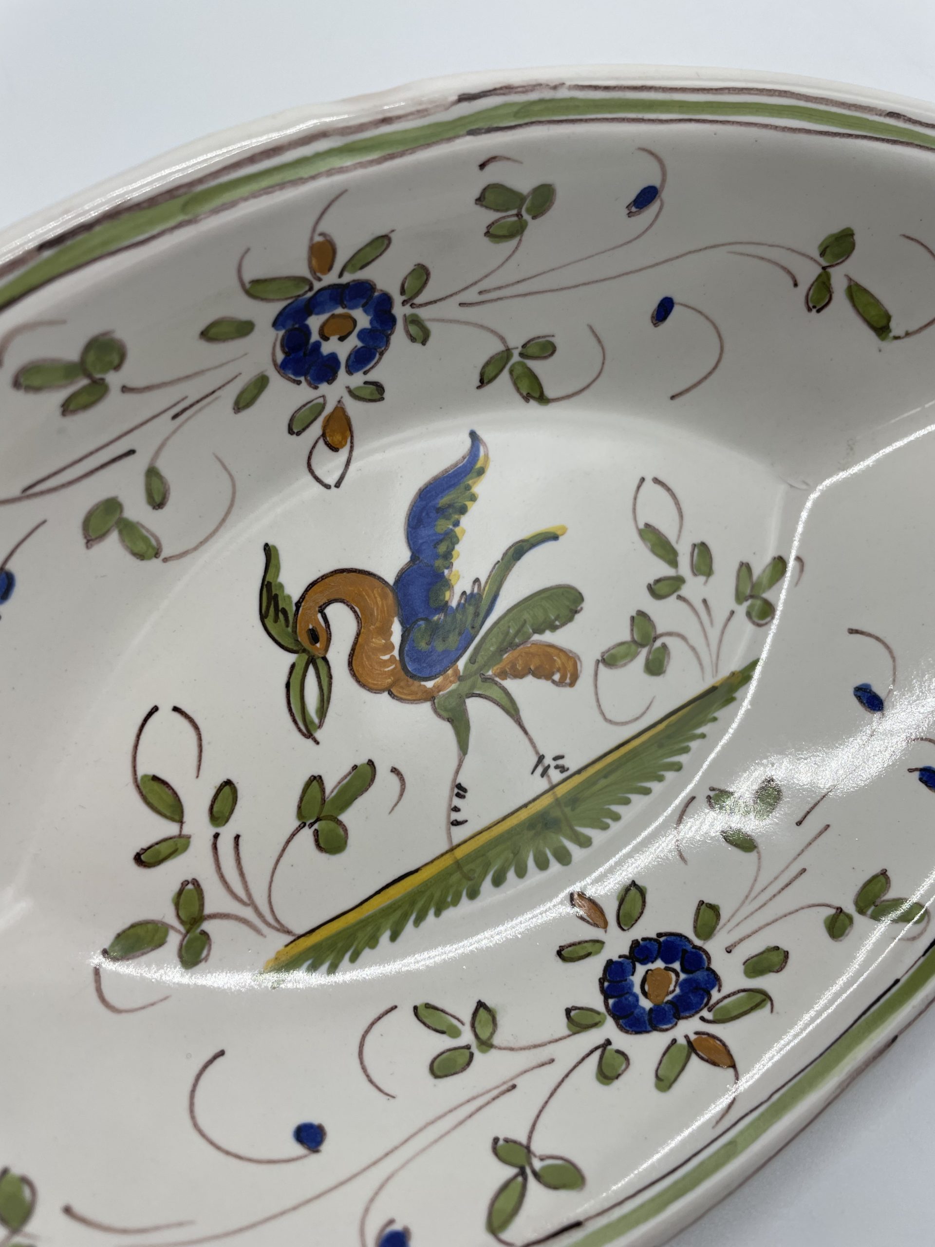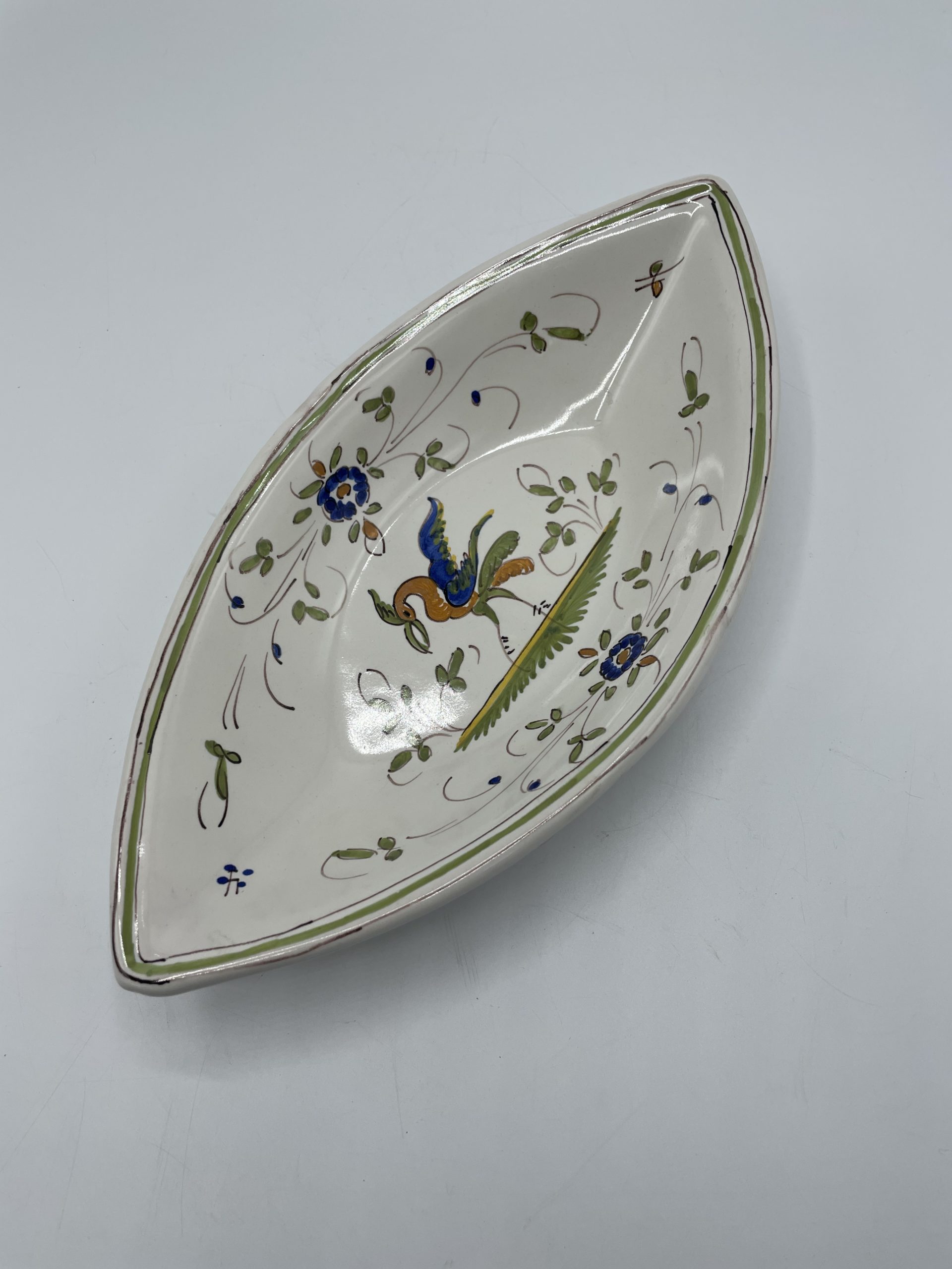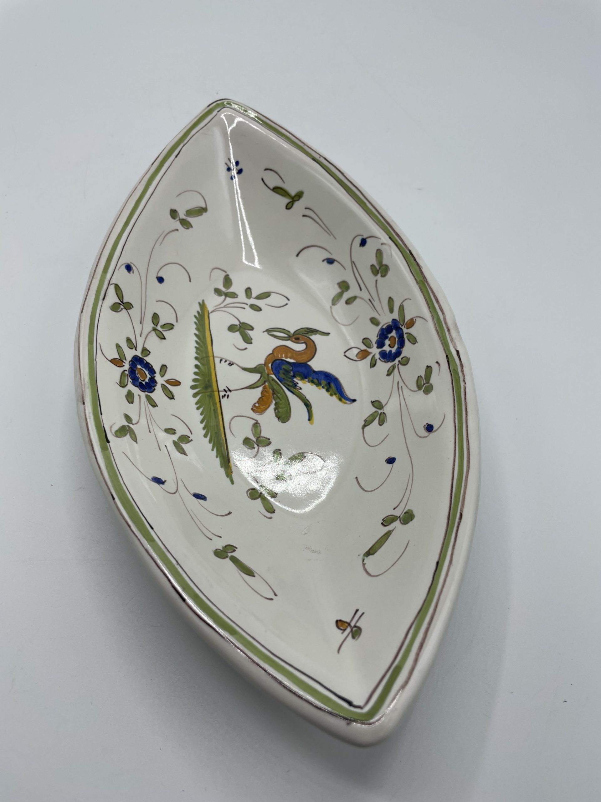 Cette belle coupelle en cĂ©ramique est signĂ©e DR Moustiers. De couleur blanche, la coupelle est dĂ©corĂ©e d’un motif d’oiseau bleu, orange et vert et d’un liserĂ© vert typique de la vaisselle de Moustiers. De forme ovale, cette coupelle est très pratique et pourra servir comme repose cuillère, vide poche ou encore prĂ©sentoir Ă bijoux !