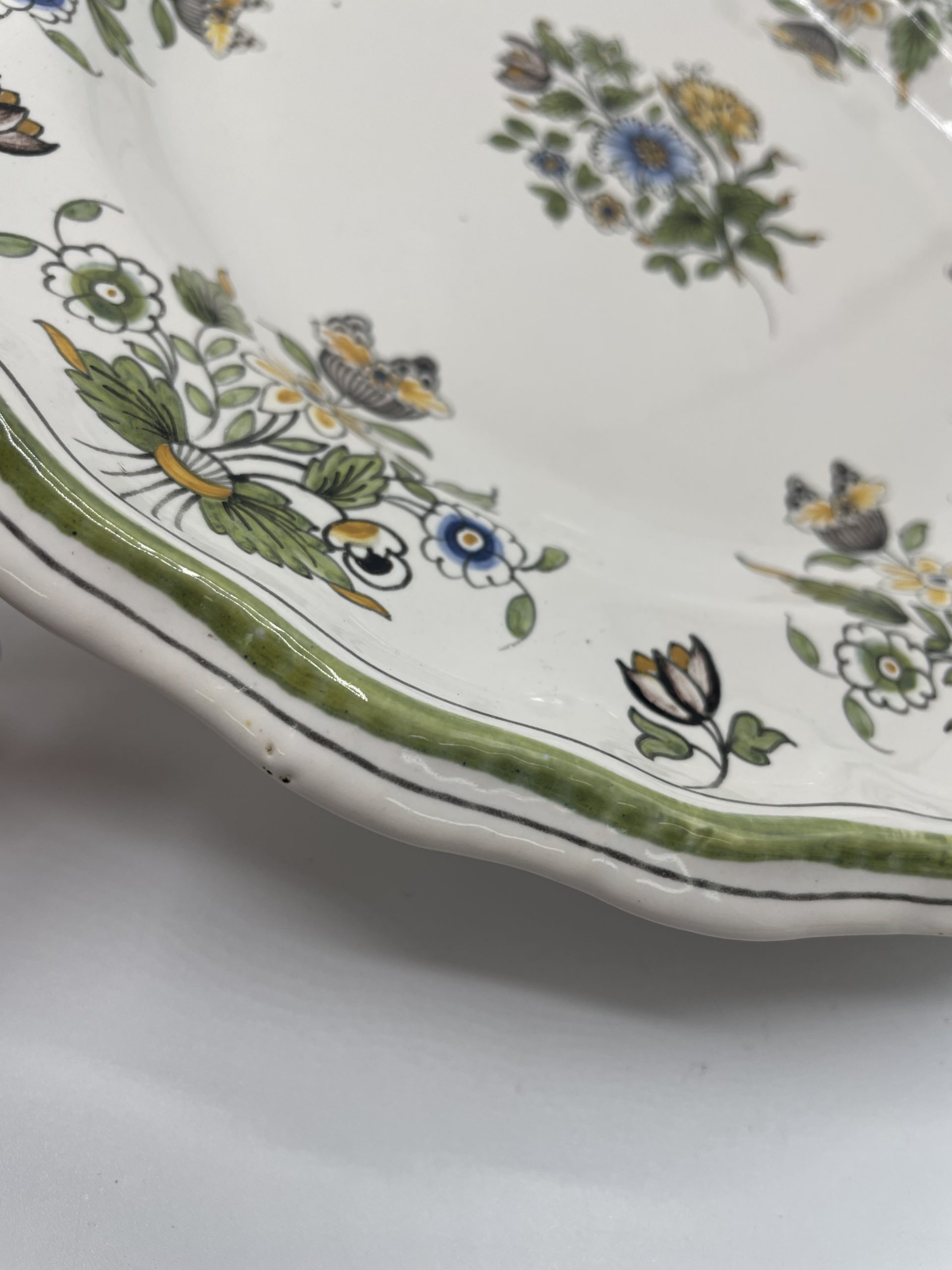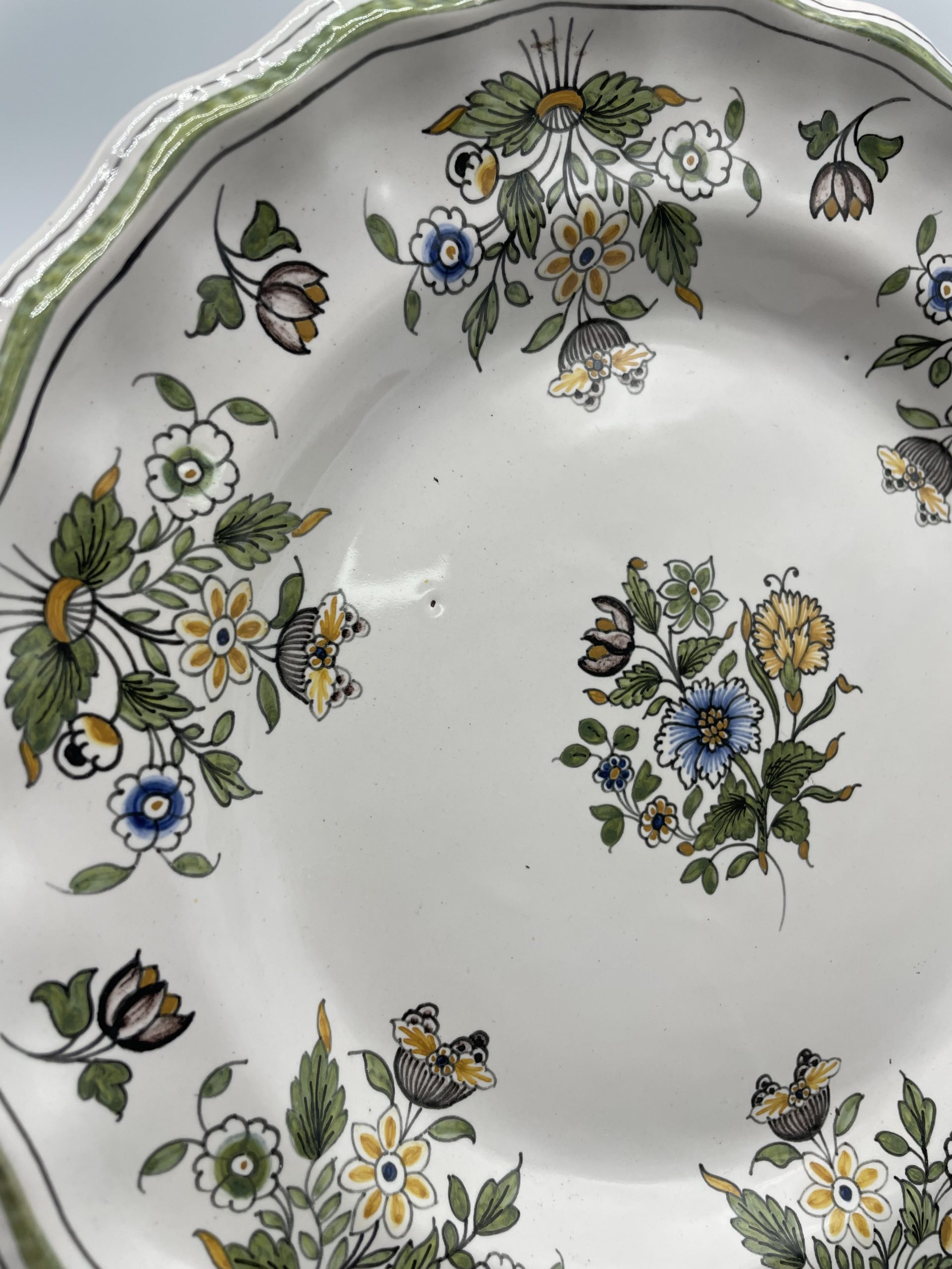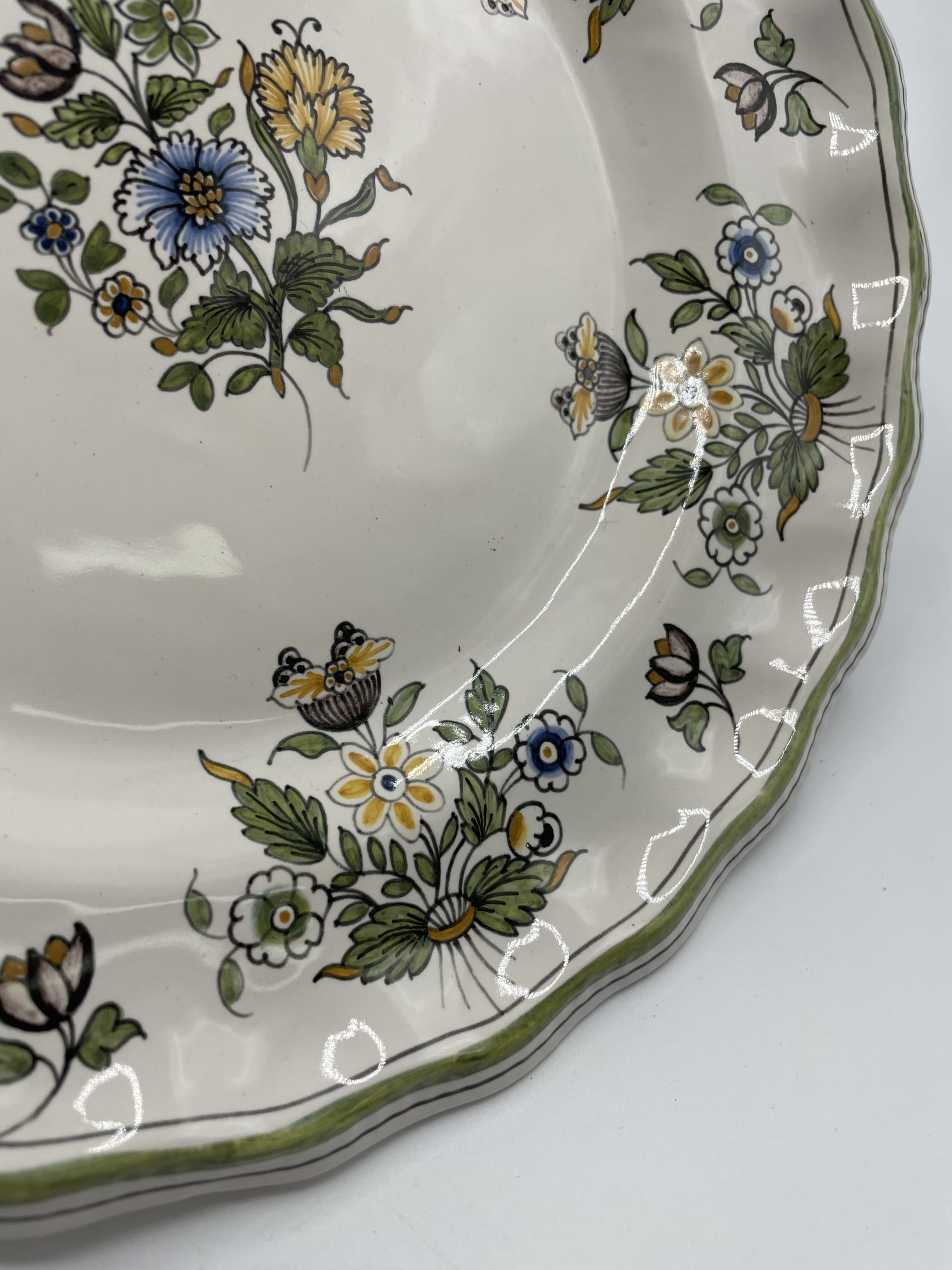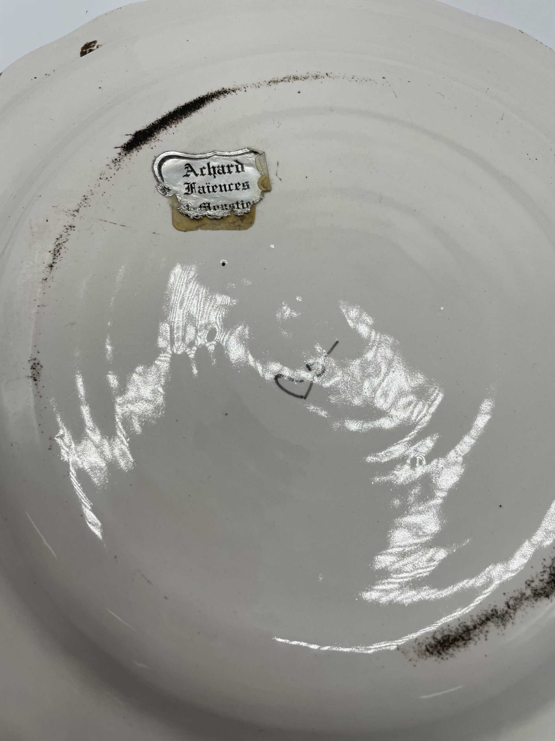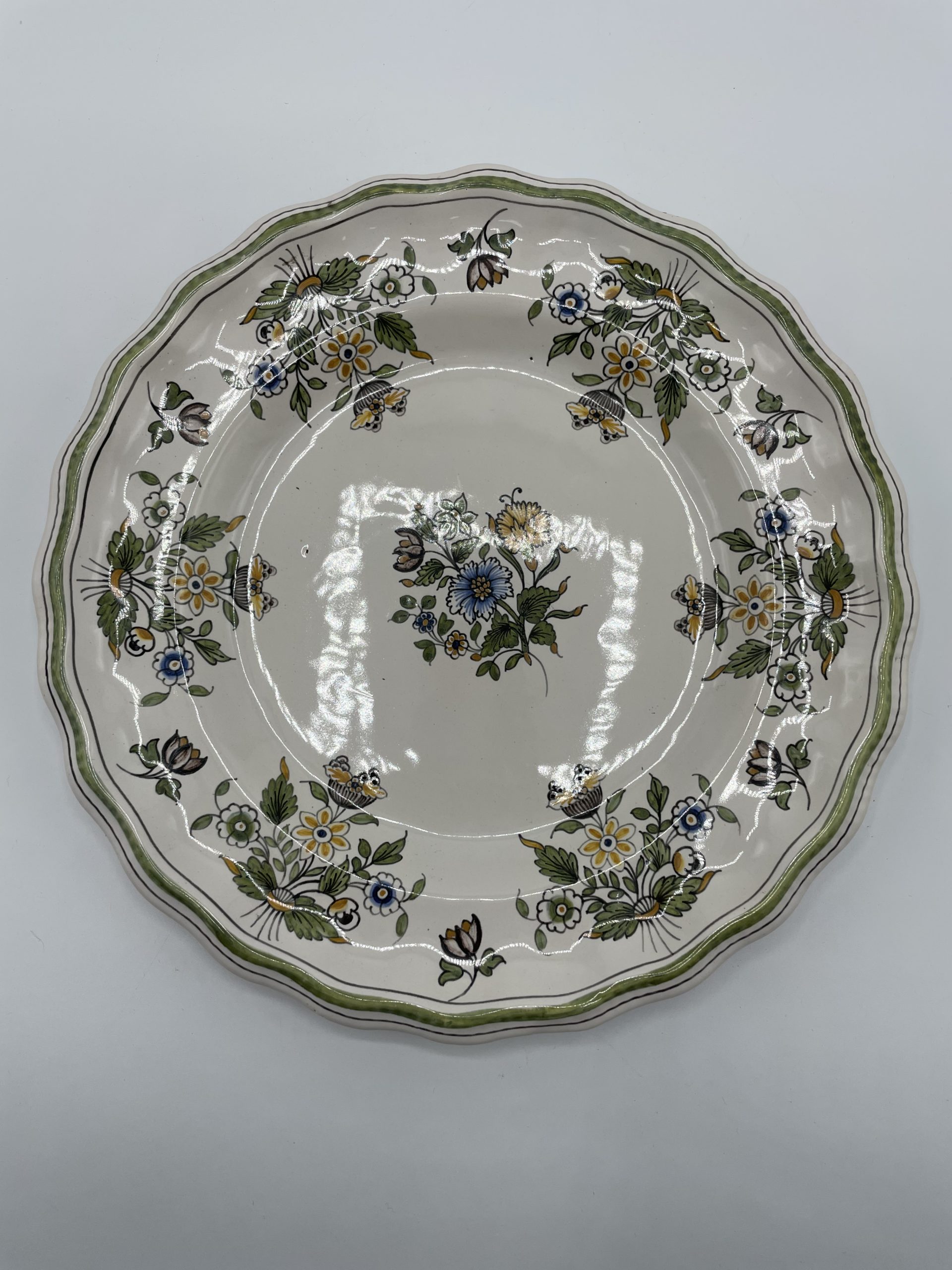 Cette jolie assiette vintage en faïence blanche est estampillée faïences Achard Moustiers. Entièrement réalisée à la main, elle a été décorée dans la tradition de la faïencerie de Moustiers avec des décors de fleurs des champ bleues jaunes et vertes et d’un joli liseré vert sur la collerette. Vintage, quelques traces d’usure sont à prévoir (cf photos) jolies marques du temps passé. Une jolie assiette vintage de collection !