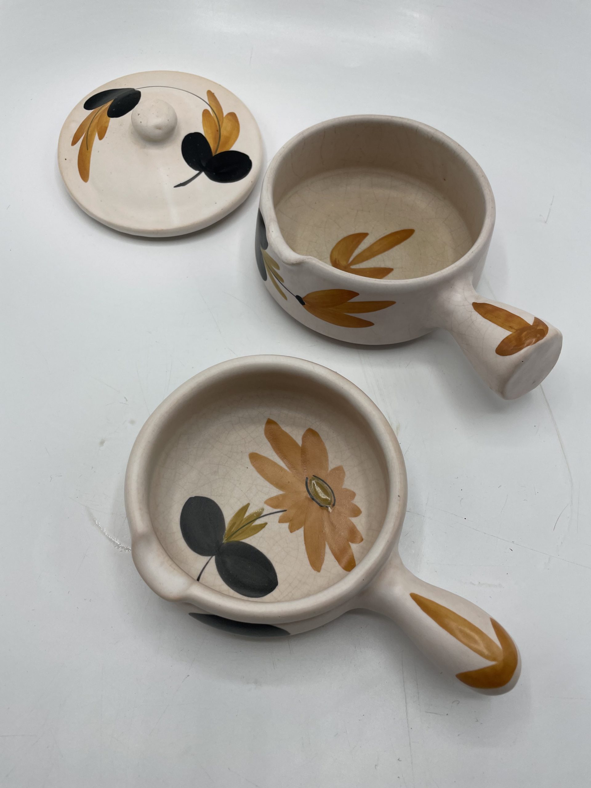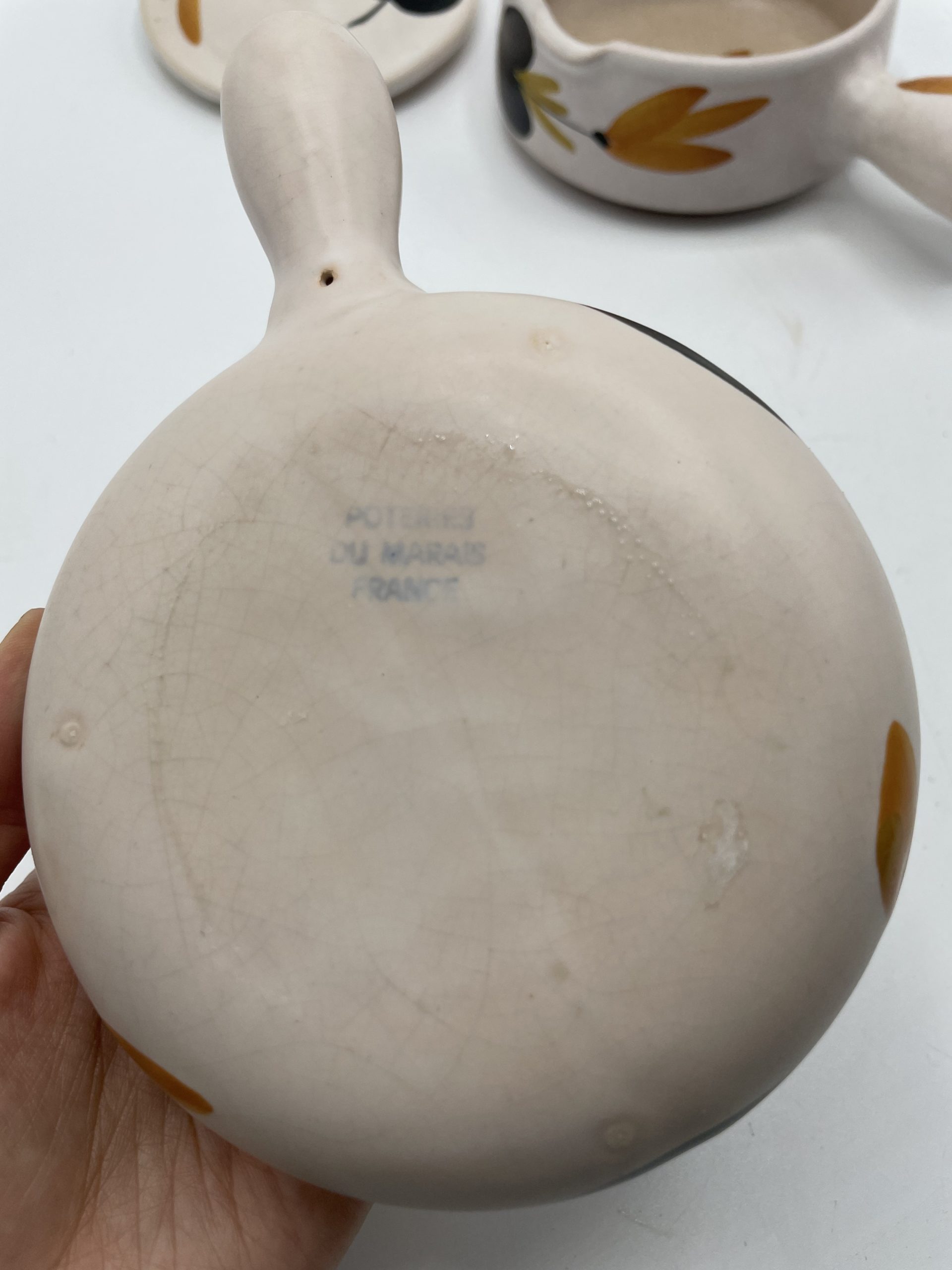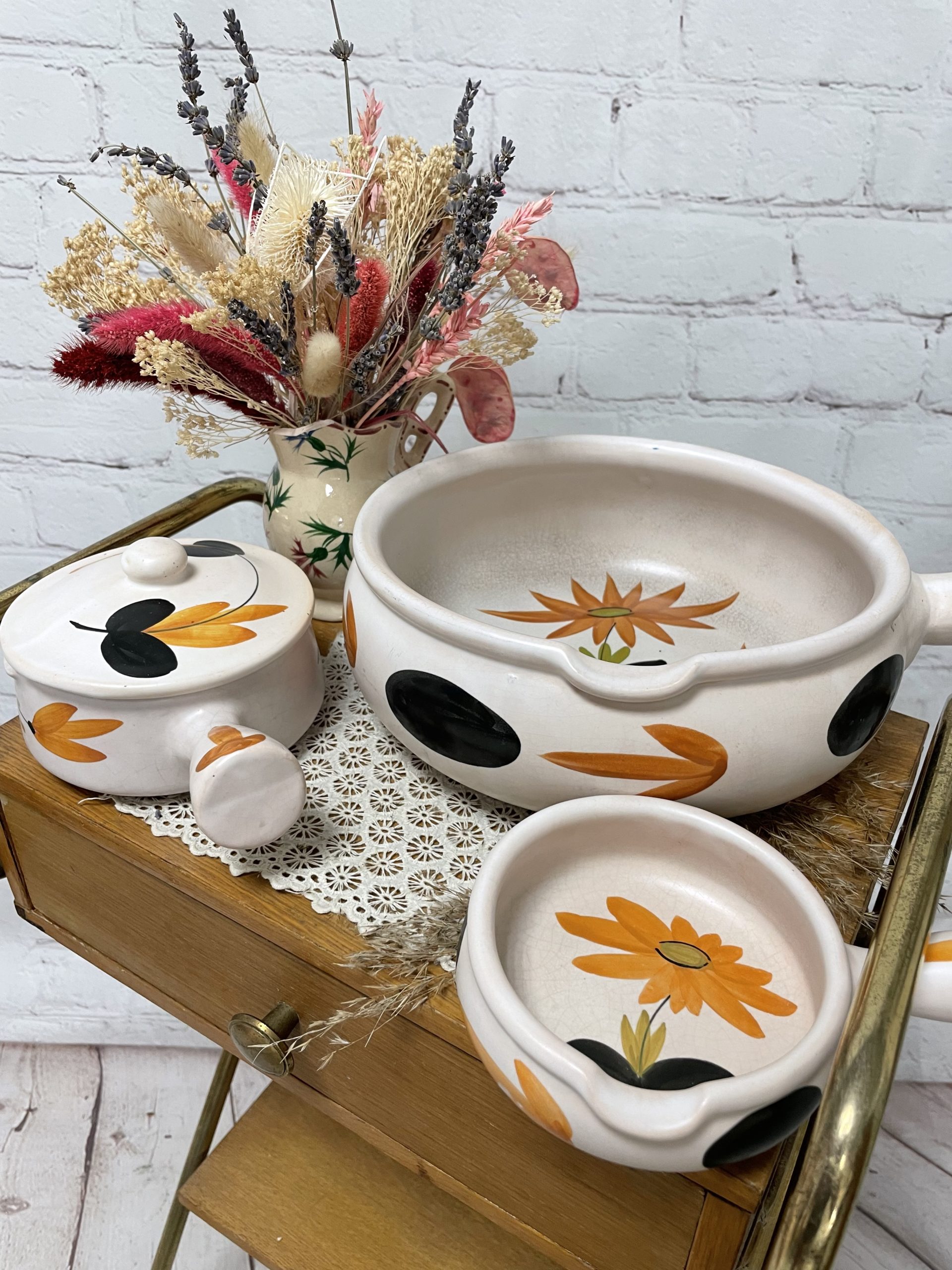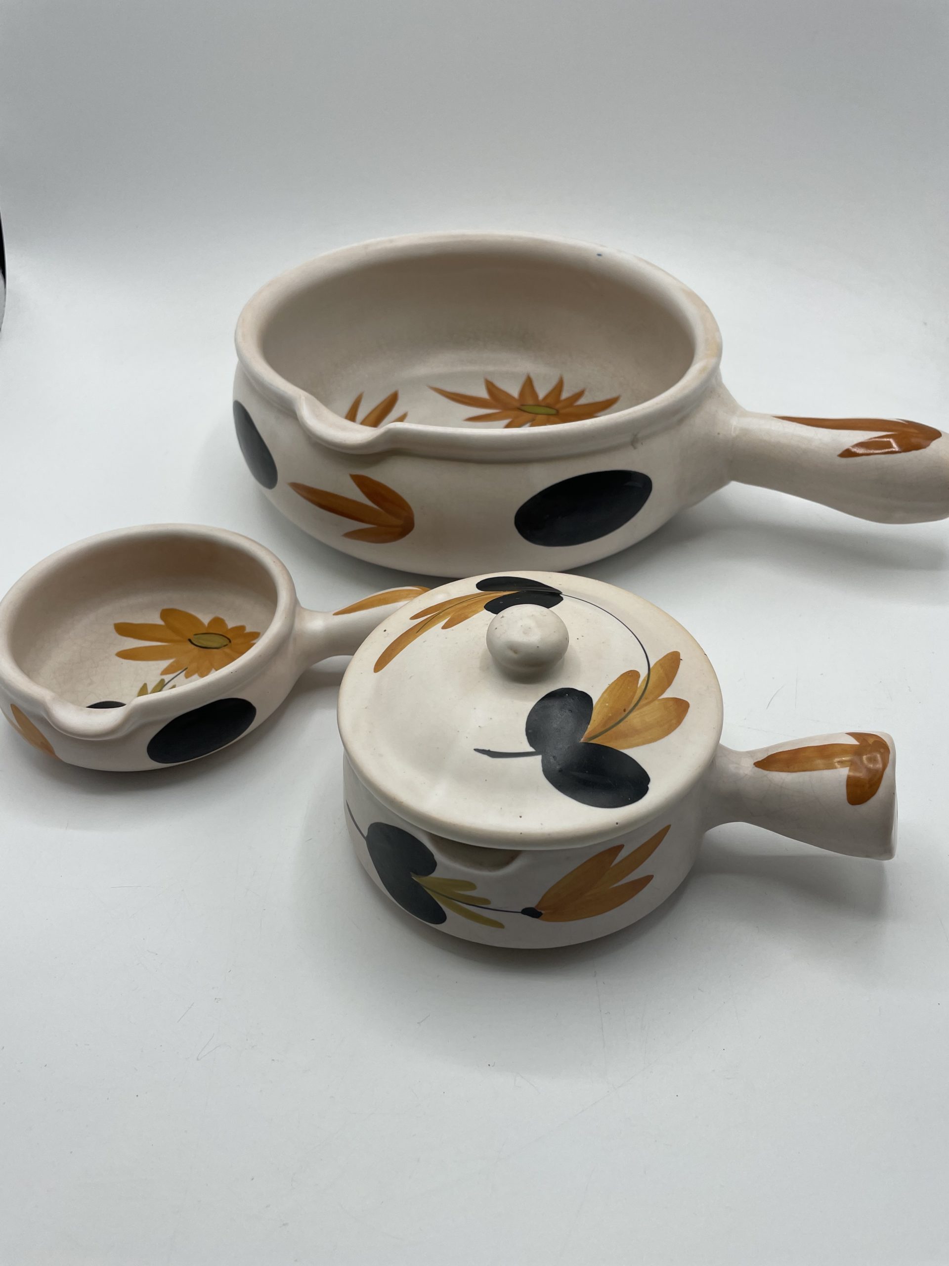 On craque d’amour pour ce joli lot qui se compose de 3 saucières de tailles différentes. En forme de caquelons, les saucières sont équipées ‘un bec verseur et d’une poignée qui facilite leur utilisation. En terre cuite, elles sont estampillées Poterie du Marais et il s’agit de pièces artisanales uniques! D’une jolie couleur entre le beige et le rose pâle, les saucières sont décorées de motifs de fleurs de c couleur jaune orangée et noir. Vintage, des traces d’usure sont à prévoir (cf photos) jolies marques du temps passé. Un joli trio de saucières idéales pour la cuisine ou à poser sur table !