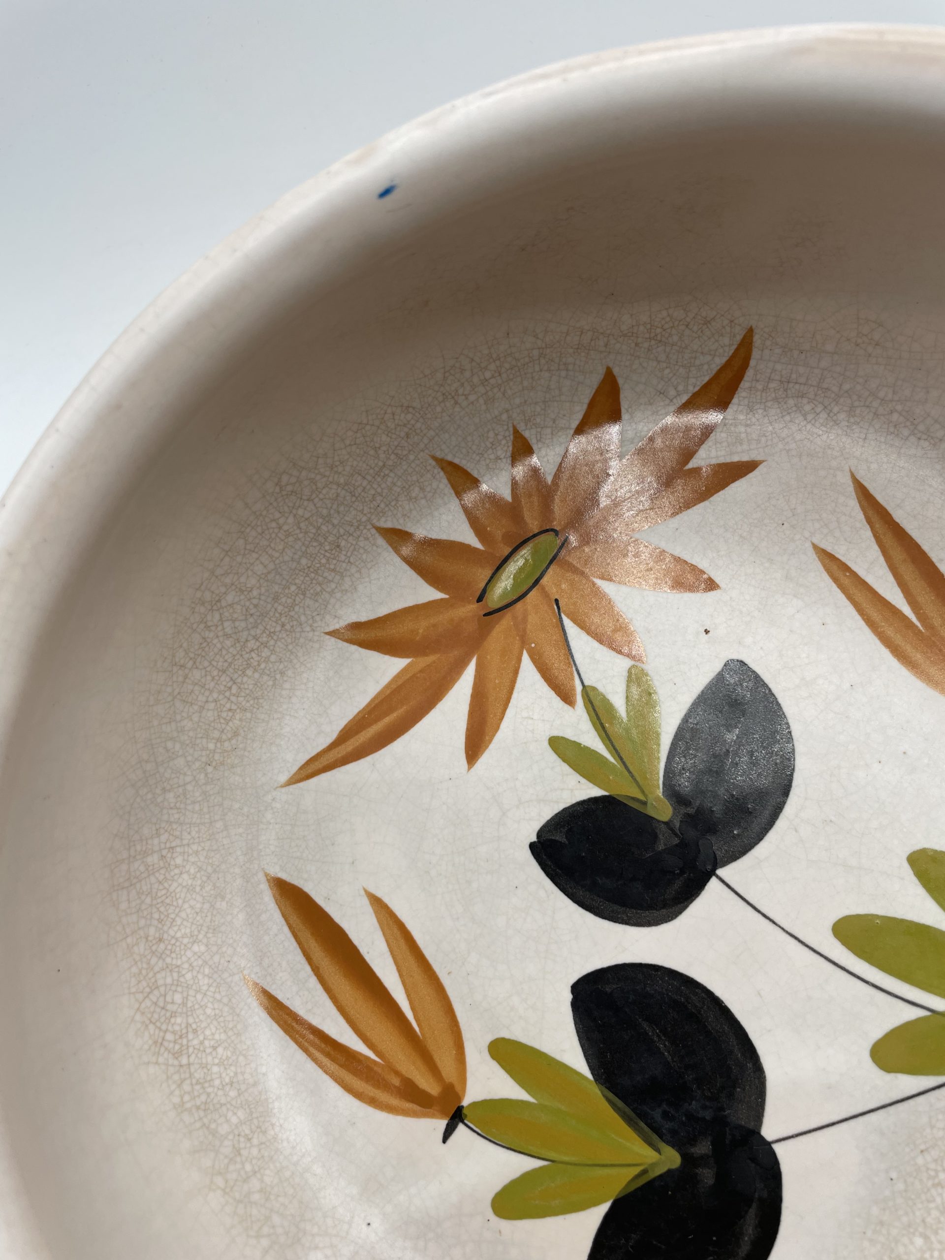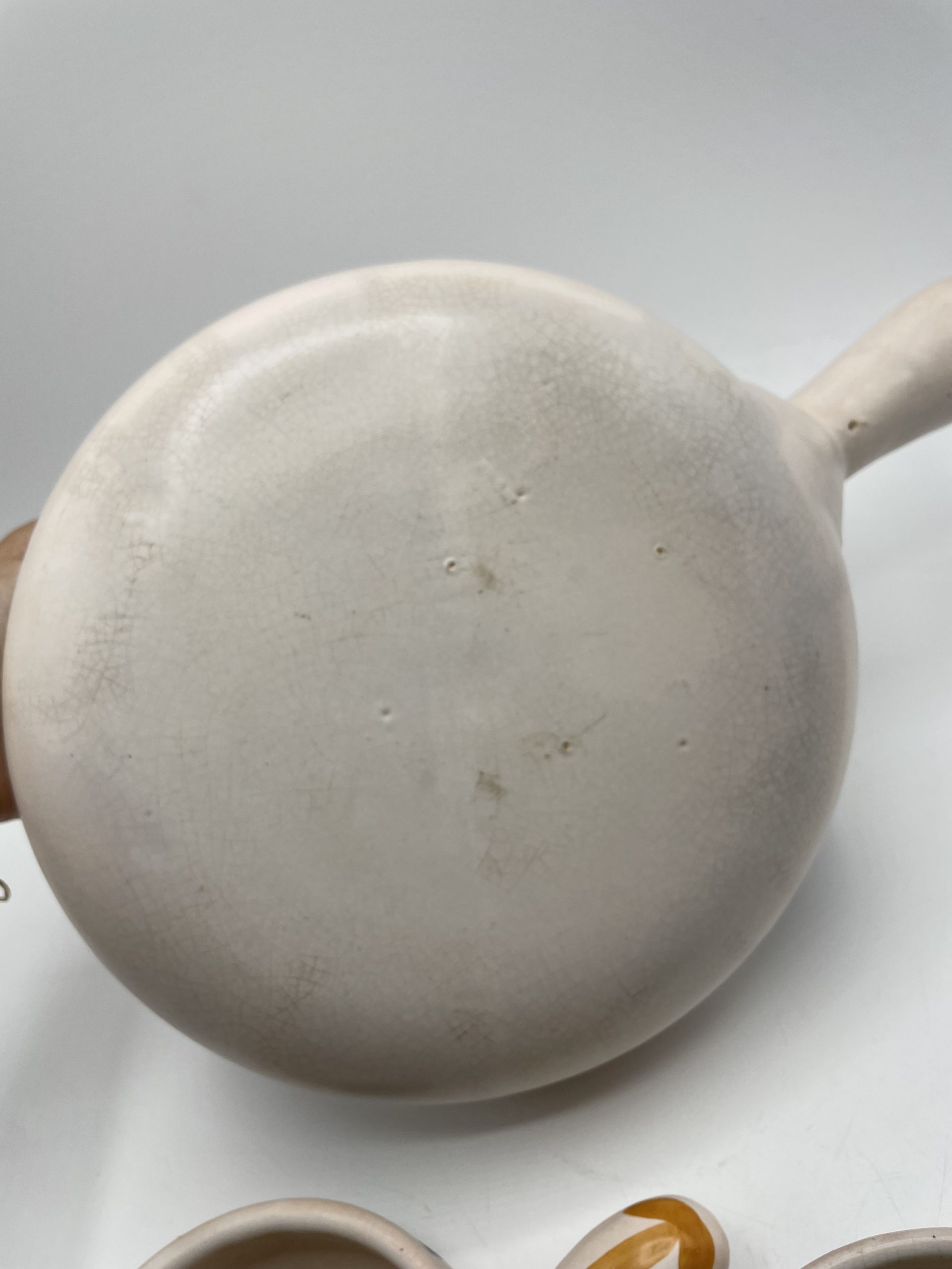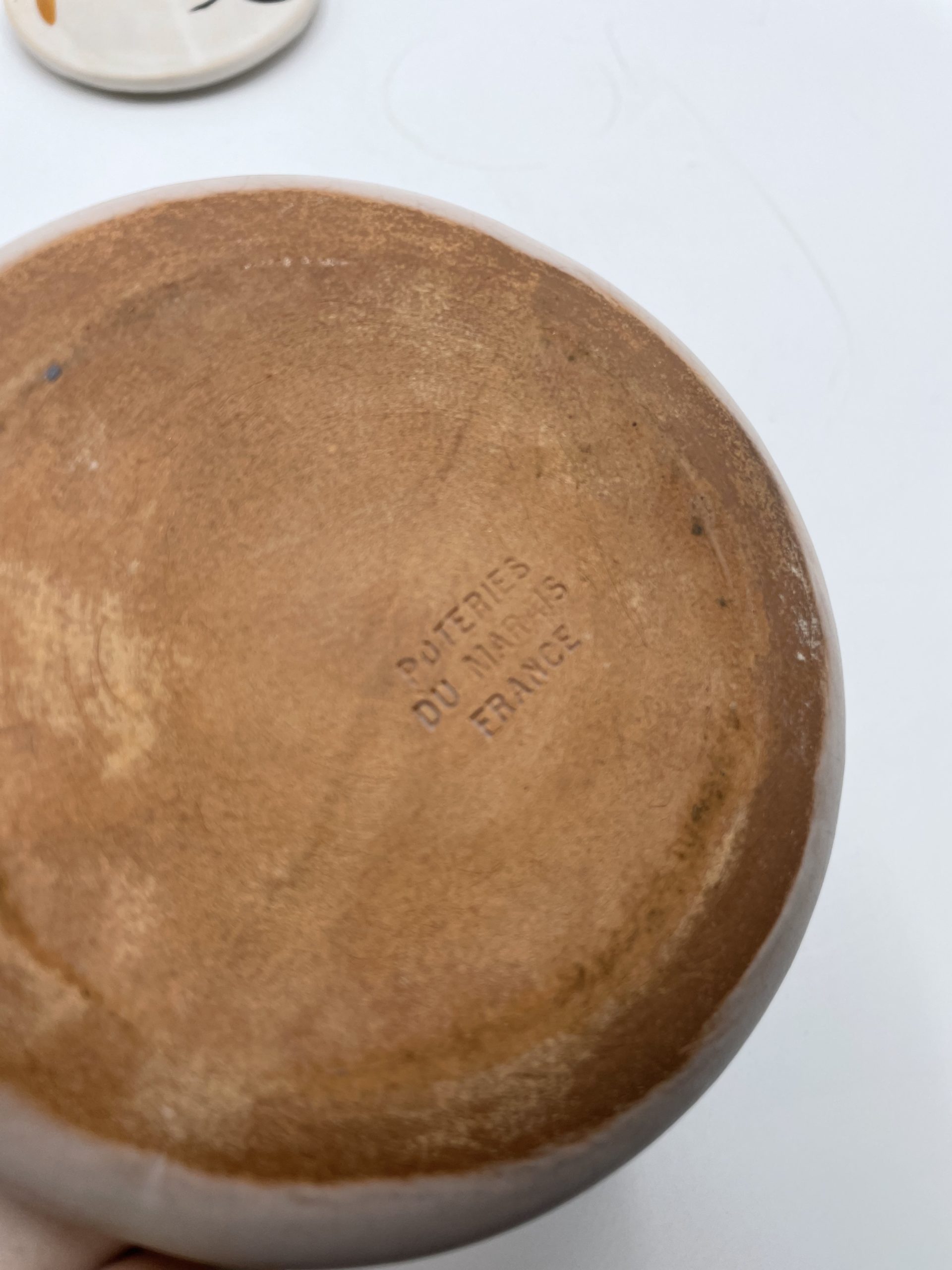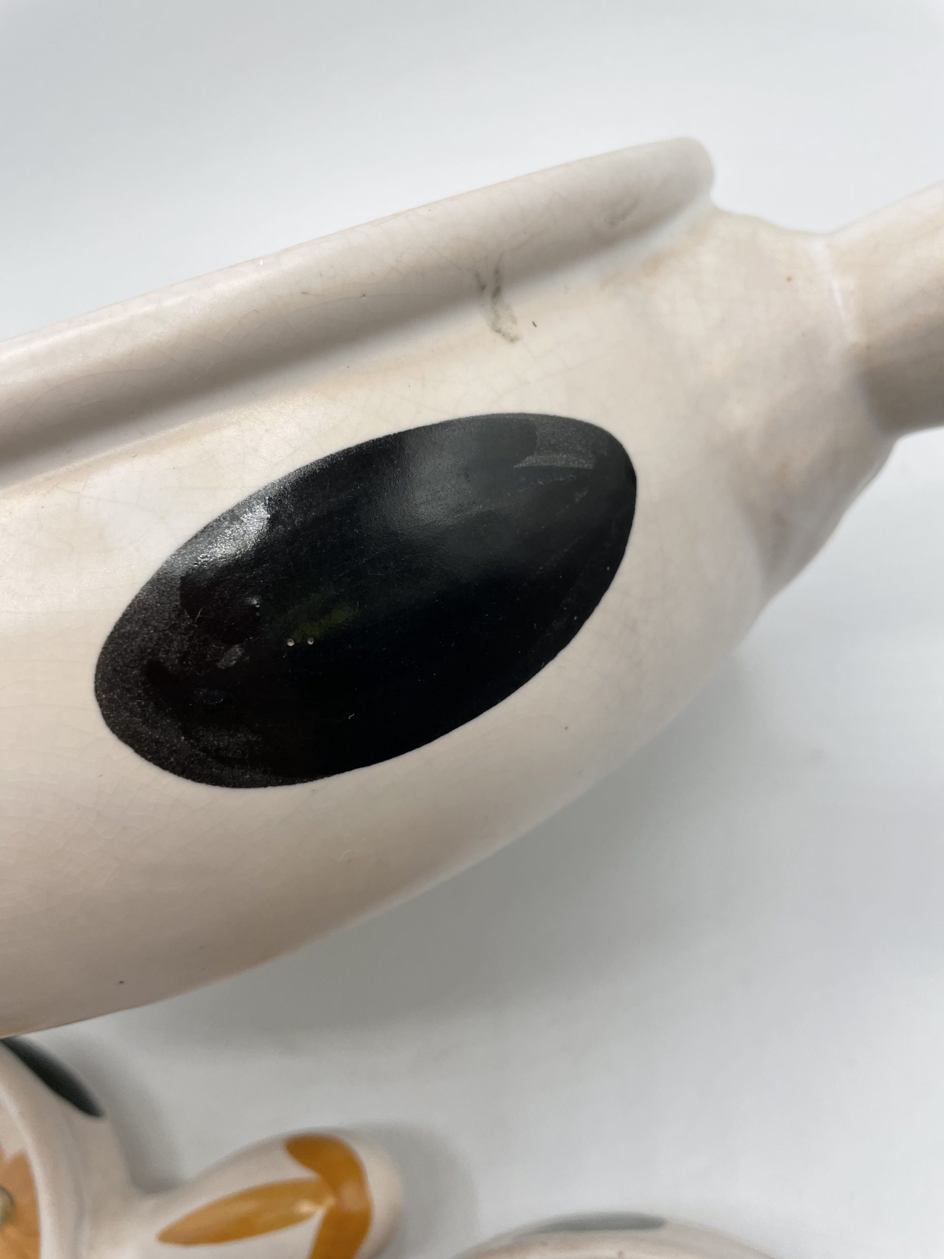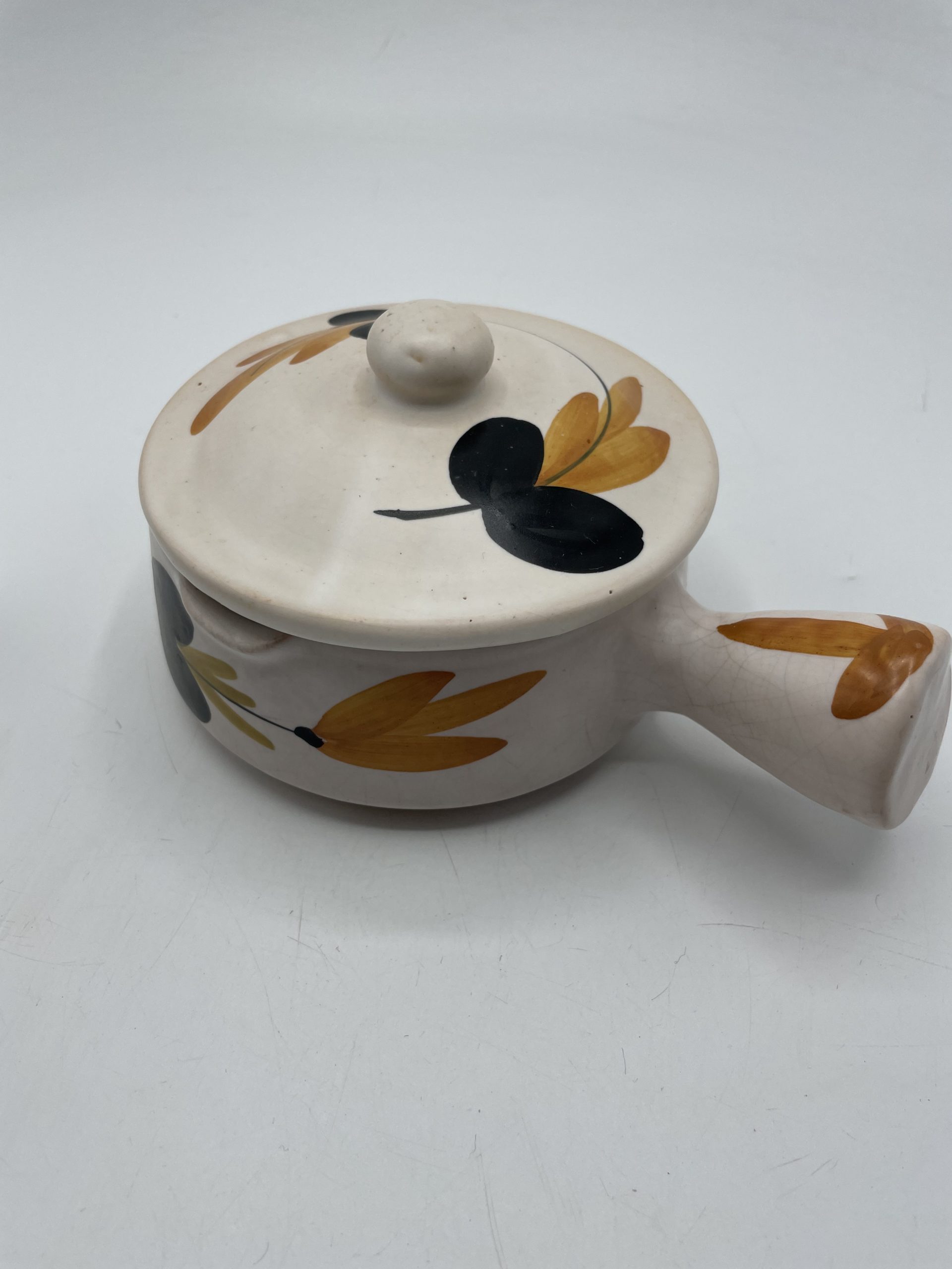 On craque d’amour pour ce joli lot qui se compose de 3 saucières de tailles différentes. En forme de caquelons, les saucières sont équipées ‘un bec verseur et d’une poignée qui facilite leur utilisation. En terre cuite, elles sont estampillées Poterie du Marais et il s’agit de pièces artisanales uniques! D’une jolie couleur entre le beige et le rose pâle, les saucières sont décorées de motifs de fleurs de c couleur jaune orangée et noir. Vintage, des traces d’usure sont à prévoir (cf photos) jolies marques du temps passé. Un joli trio de saucières idéales pour la cuisine ou à poser sur table !