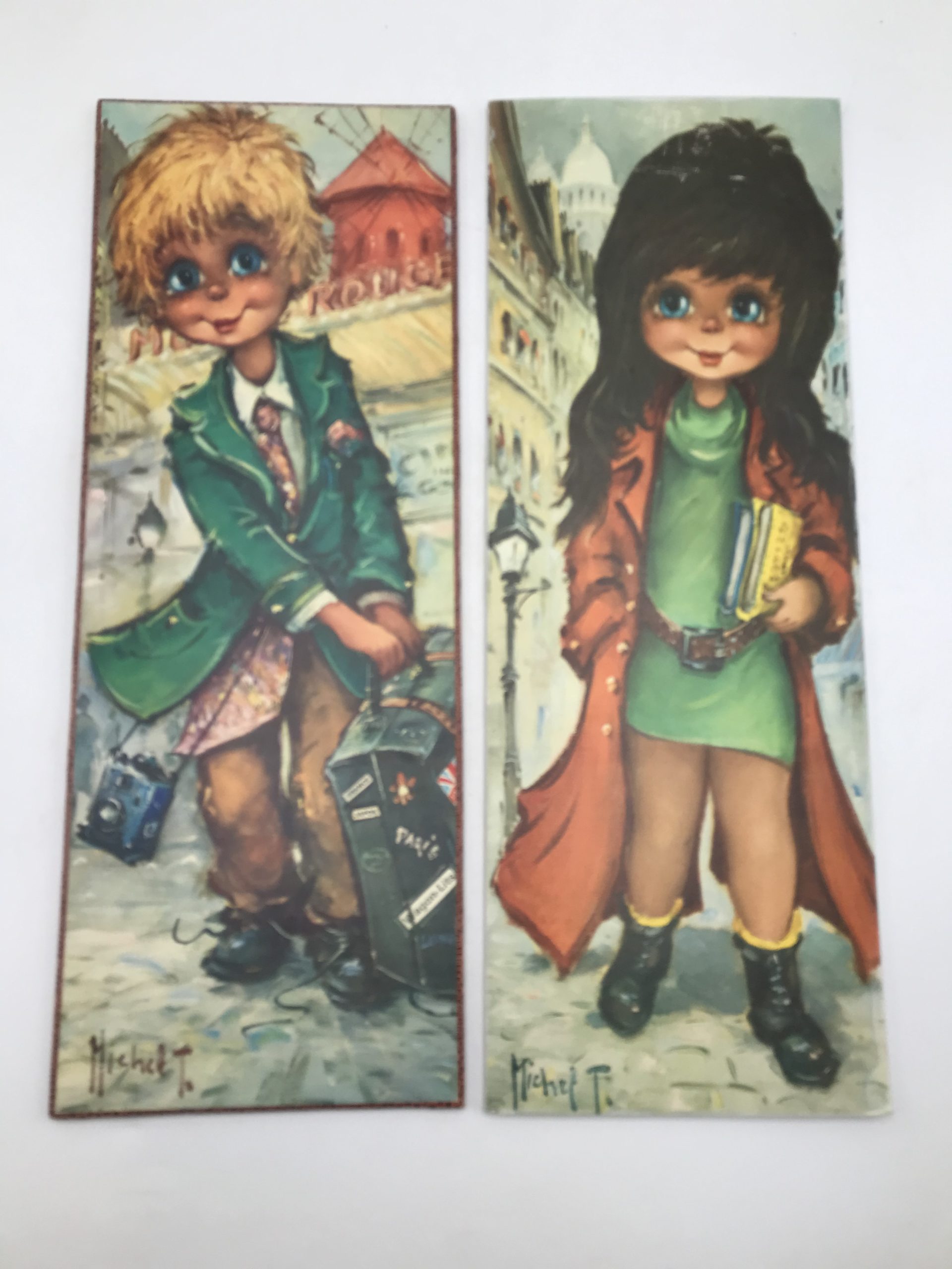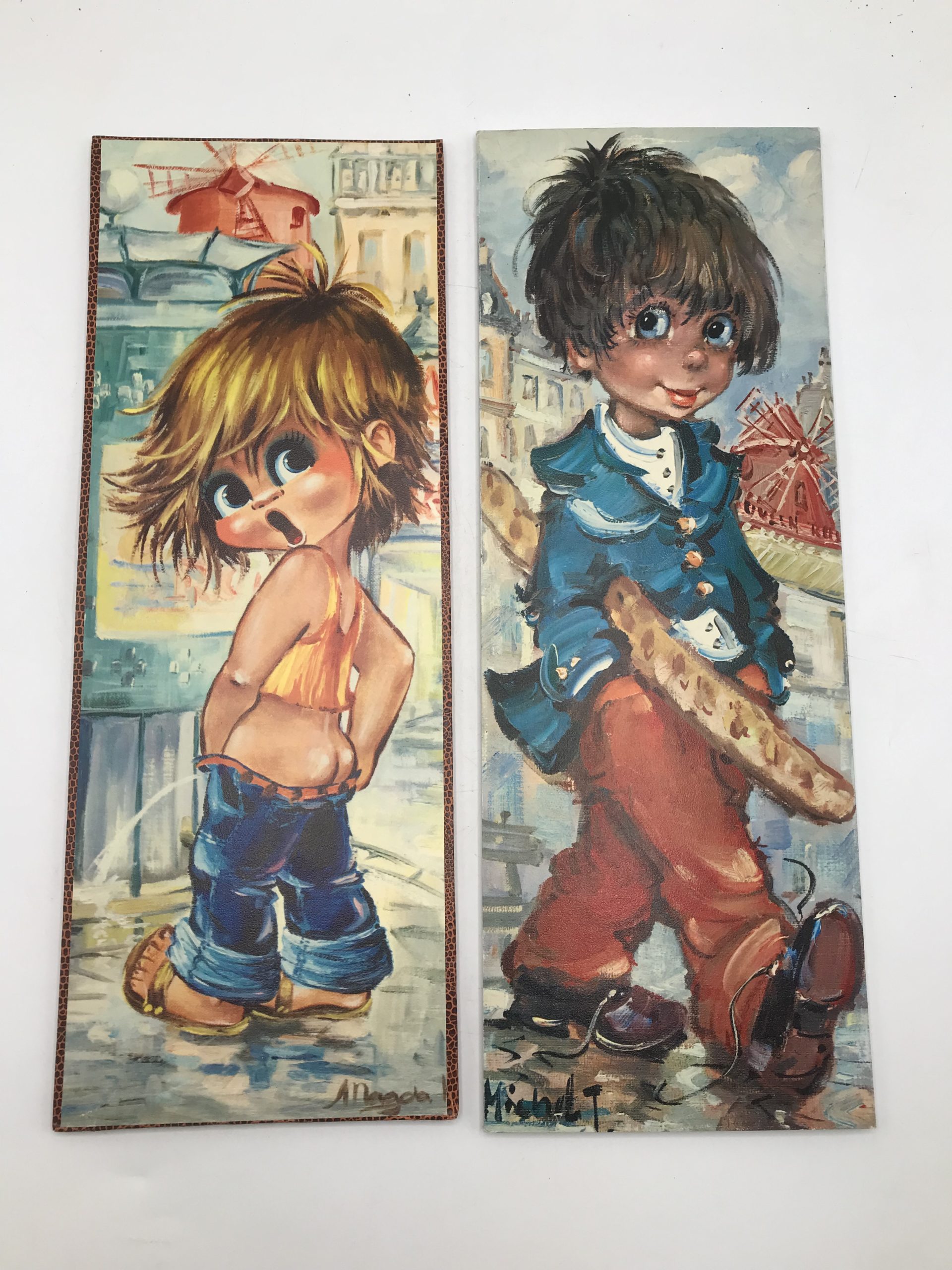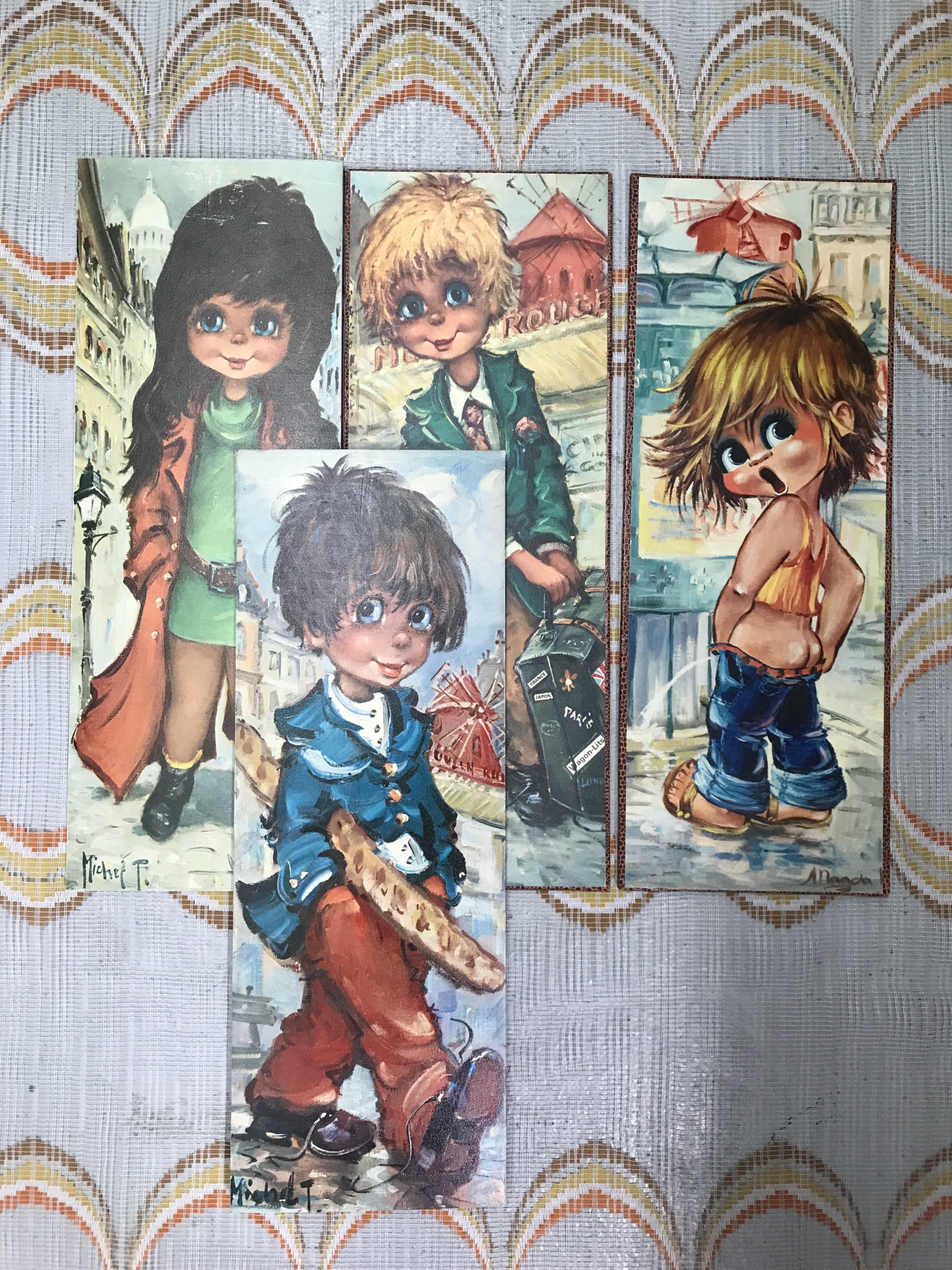 Lot de 4 plaques de bois avec impressions Michel Thomas et autres artistes du même genre. Très vintage années 1970 représentant des enfants aux visages étonnés ou angéliques. Une belle touche déco pour une ambiance vintage à coup sur !!!! Avis aux amateurs de ces petits bambins qui égayerons leurs murs. Les plaquettes font 15 cm sur 40 cm.
