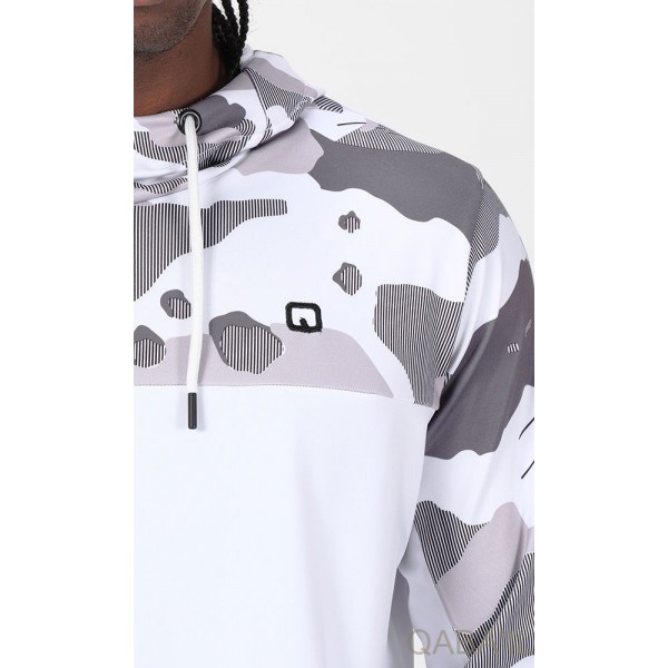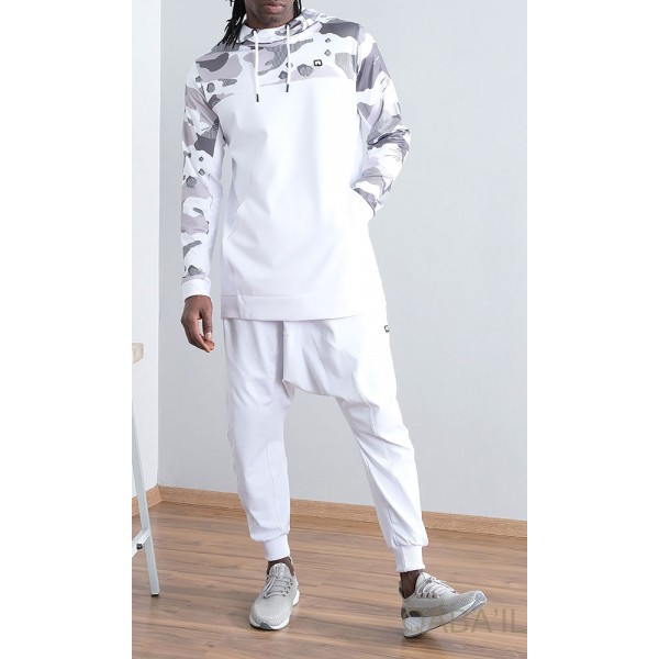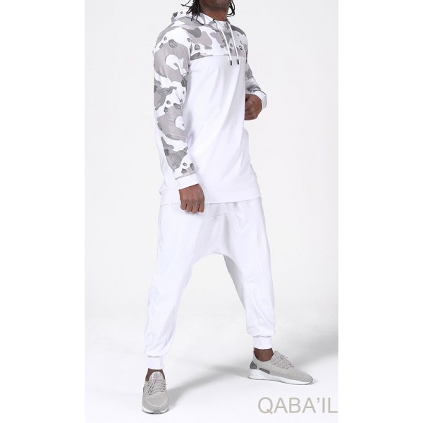Ensemble survêtement de couleur blanche composé de : – 1 sweat à capuche avec poche ventrale – 1 bas de sarouel avec coupe qadrissi en matière coton et jersey avec des poches à zip.