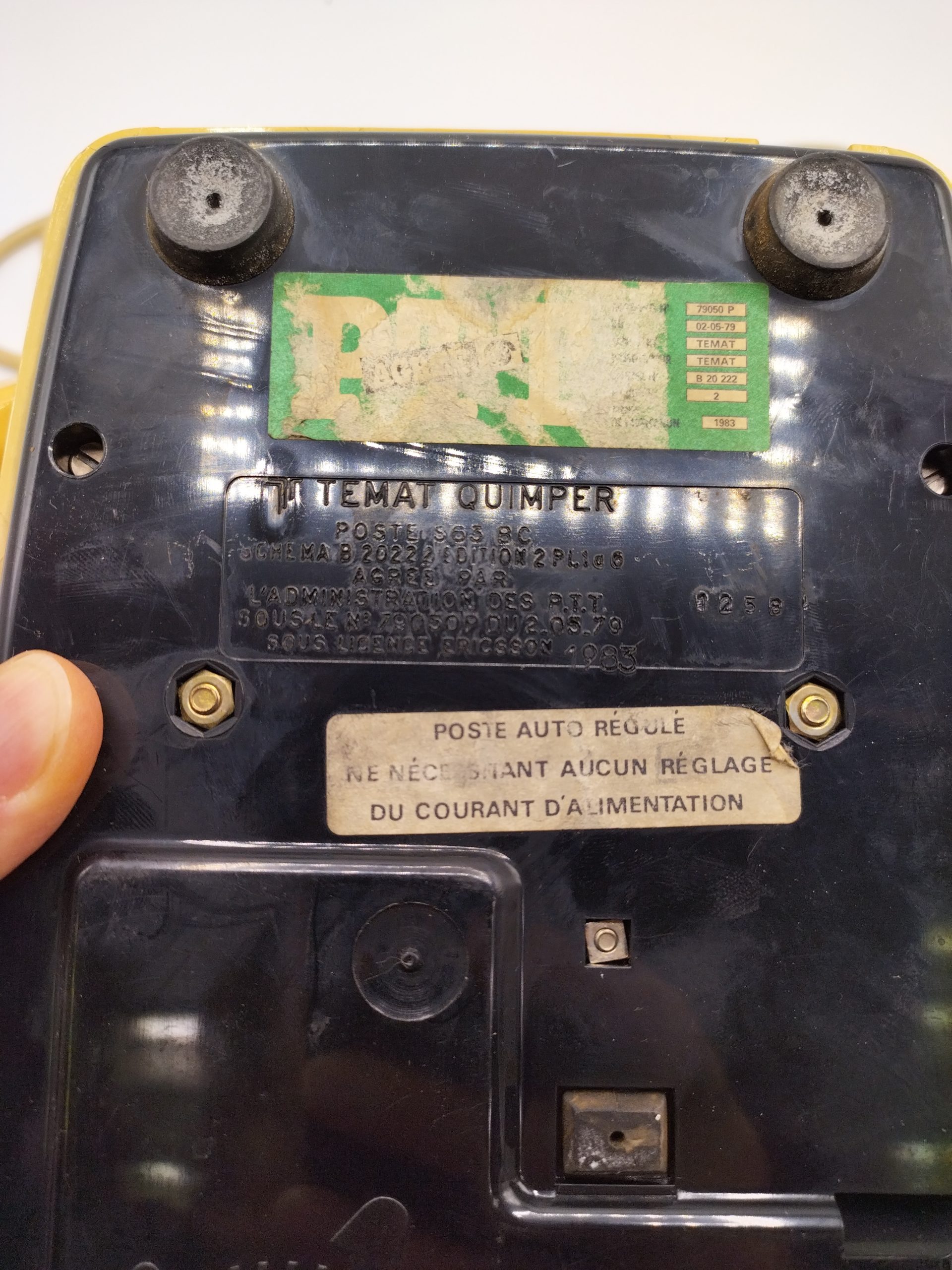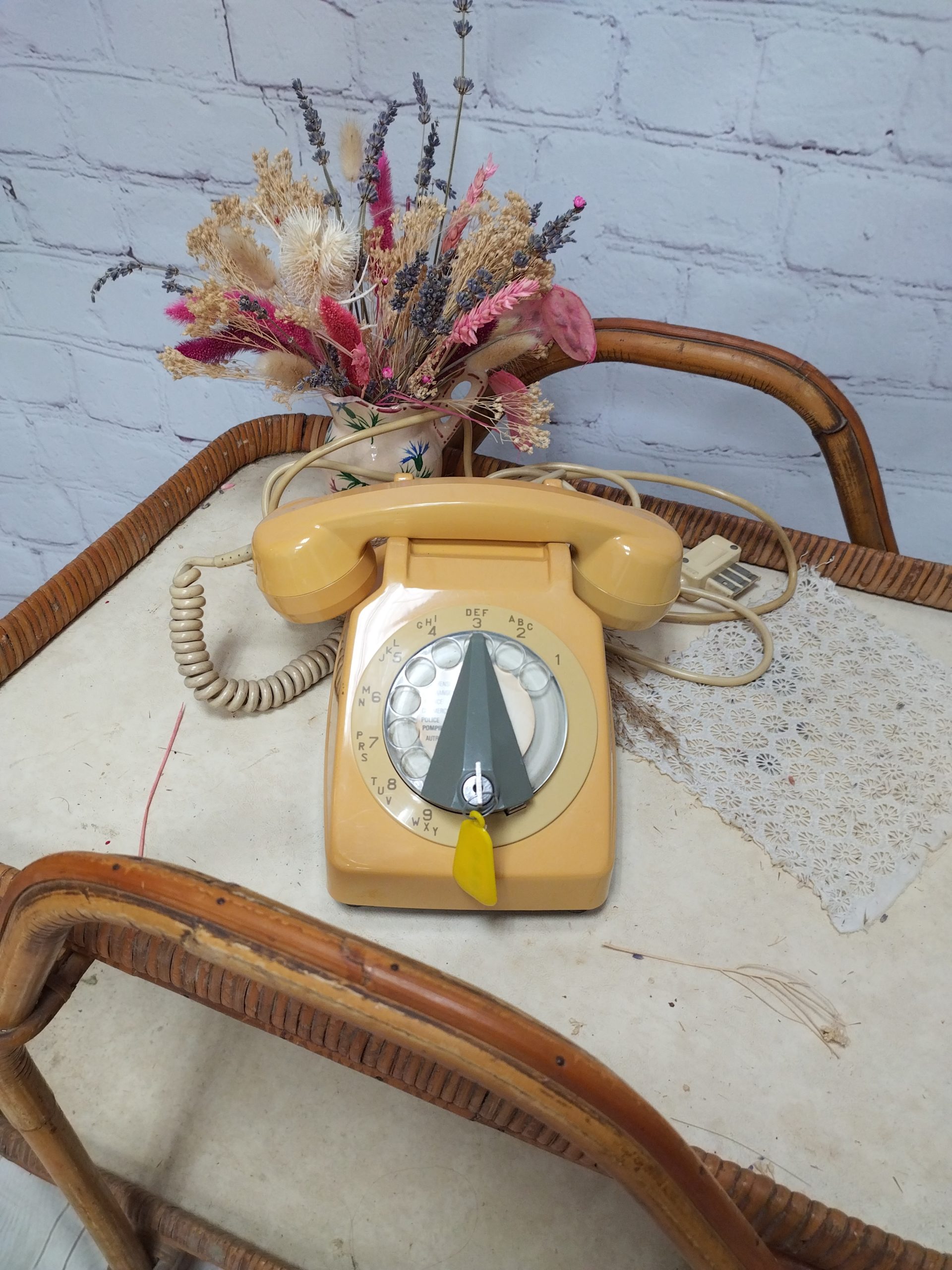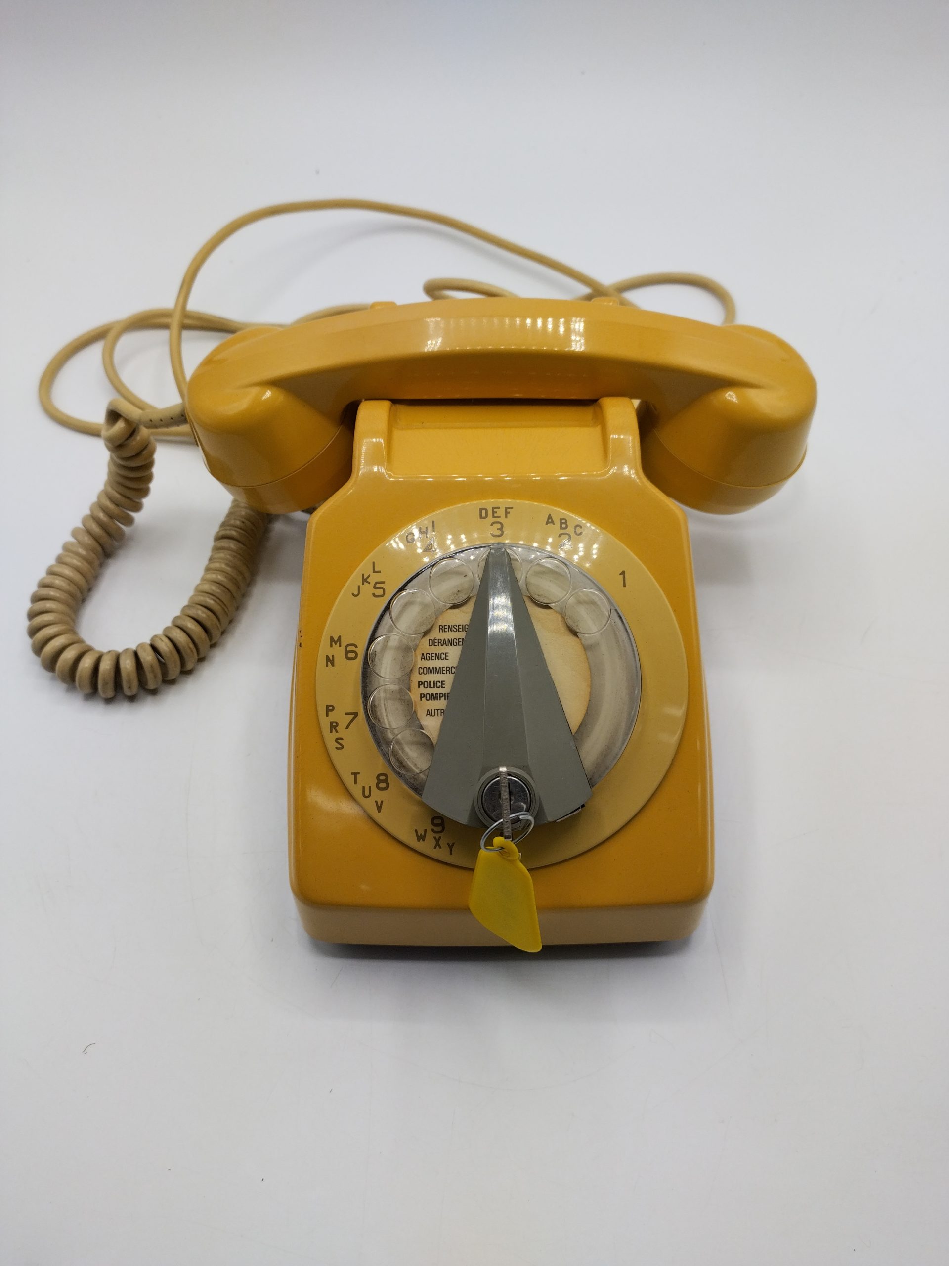 Amoureux d’objet vintage et de collection, cet ancien téléphone à cadran saura vous séduire. De couleur jaune sable, ce téléphone était un téléphone pour les bureaux de poste et PTT modèle Temat Quimper S63 de 1983. Un cache avec une clef empêcher de passer les appels depuis le téléphone lorsque le standardiste ou le secrétaire devait s’absenter. Vintage, des traces d’usure sont à prévoir (cf photos) jolies marques du temps passé. Un joli téléphone hyper rétro qu’on adore !